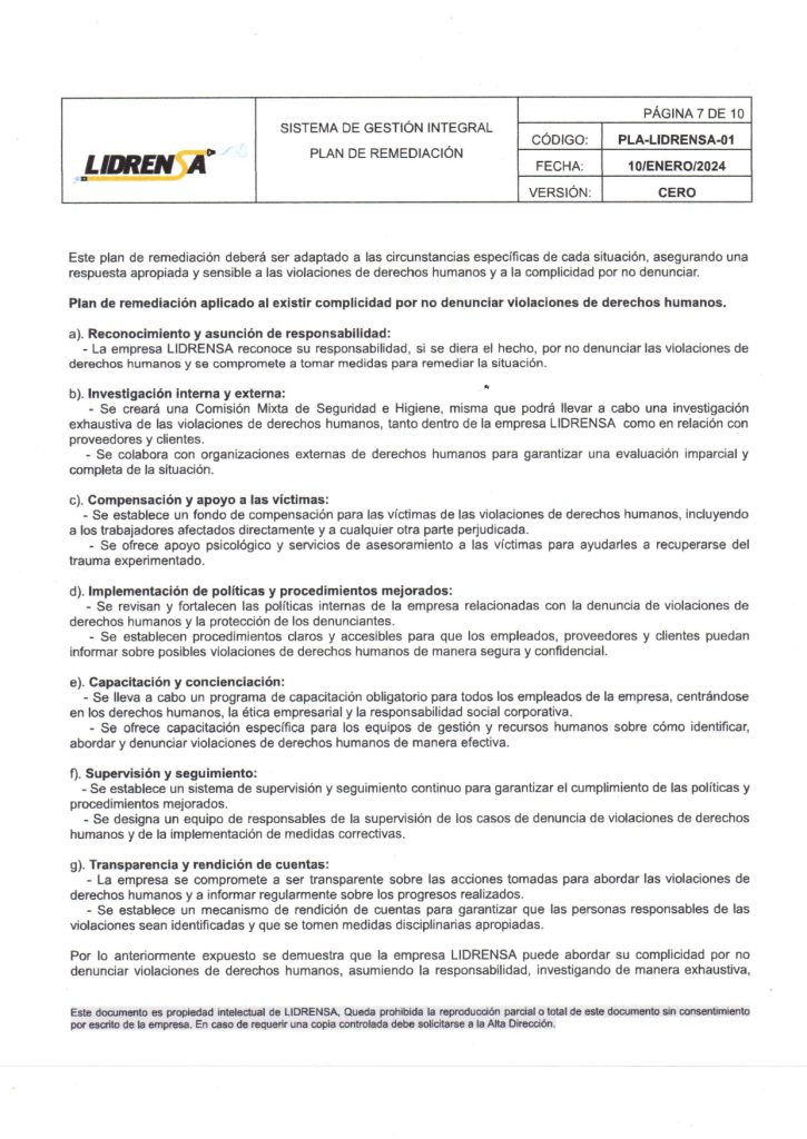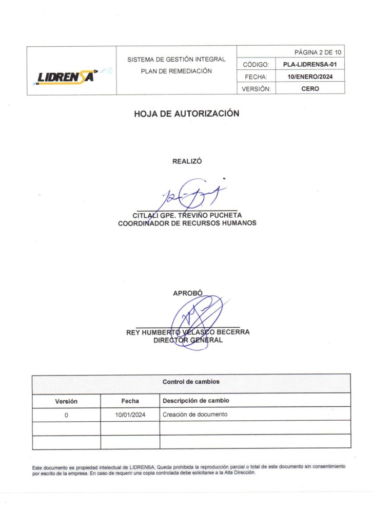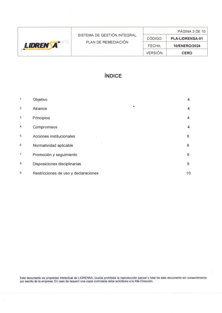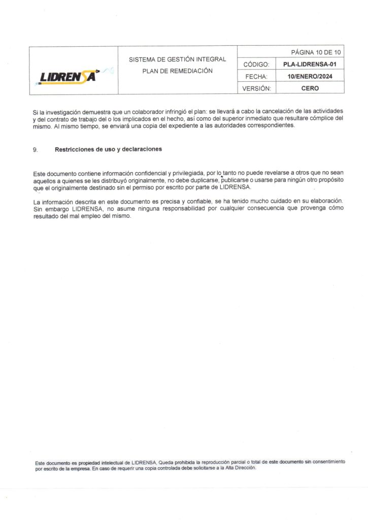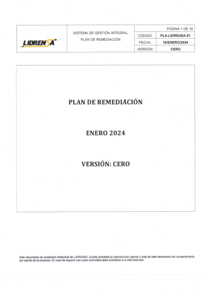 Lidrensa comparte con las partes interesadas como clientes, usuarios, socios, personas de la organización, proveedores externos nuestro Plan de remediación Enero 2024 Versión: Cero