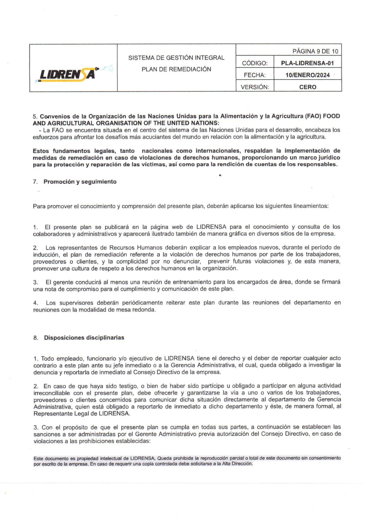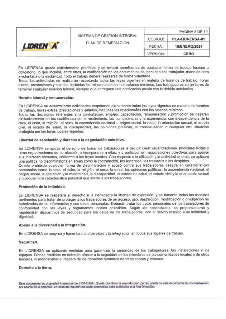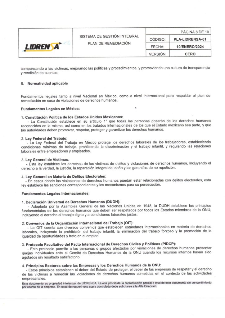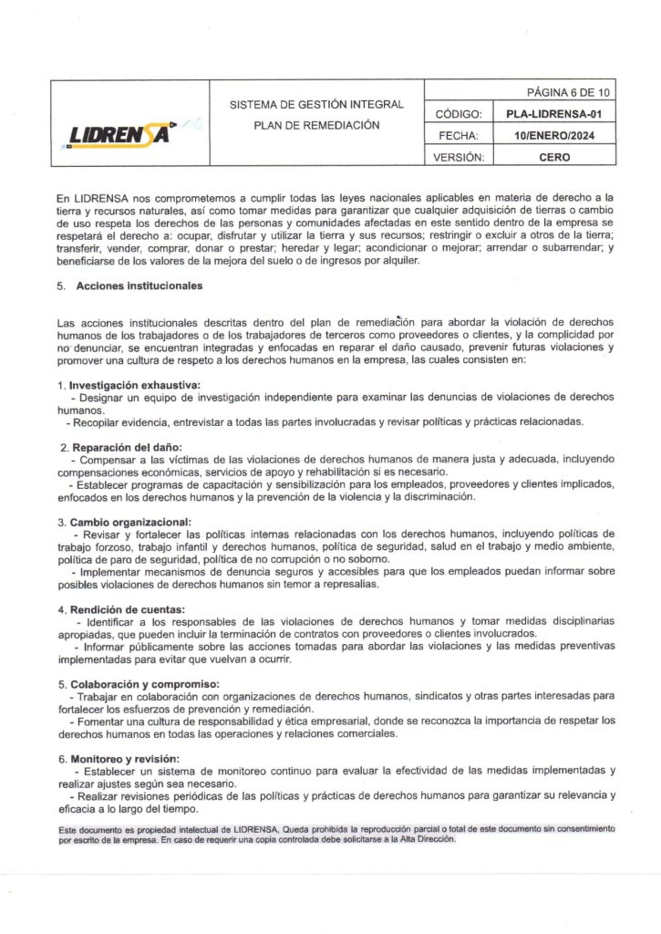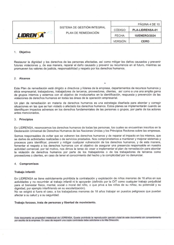 Lidrensa comparte con las partes interesadas como clientes, usuarios, socios, personas de la organización, proveedores externos nuestro Plan de remediación Enero 2024 Versión: Cero