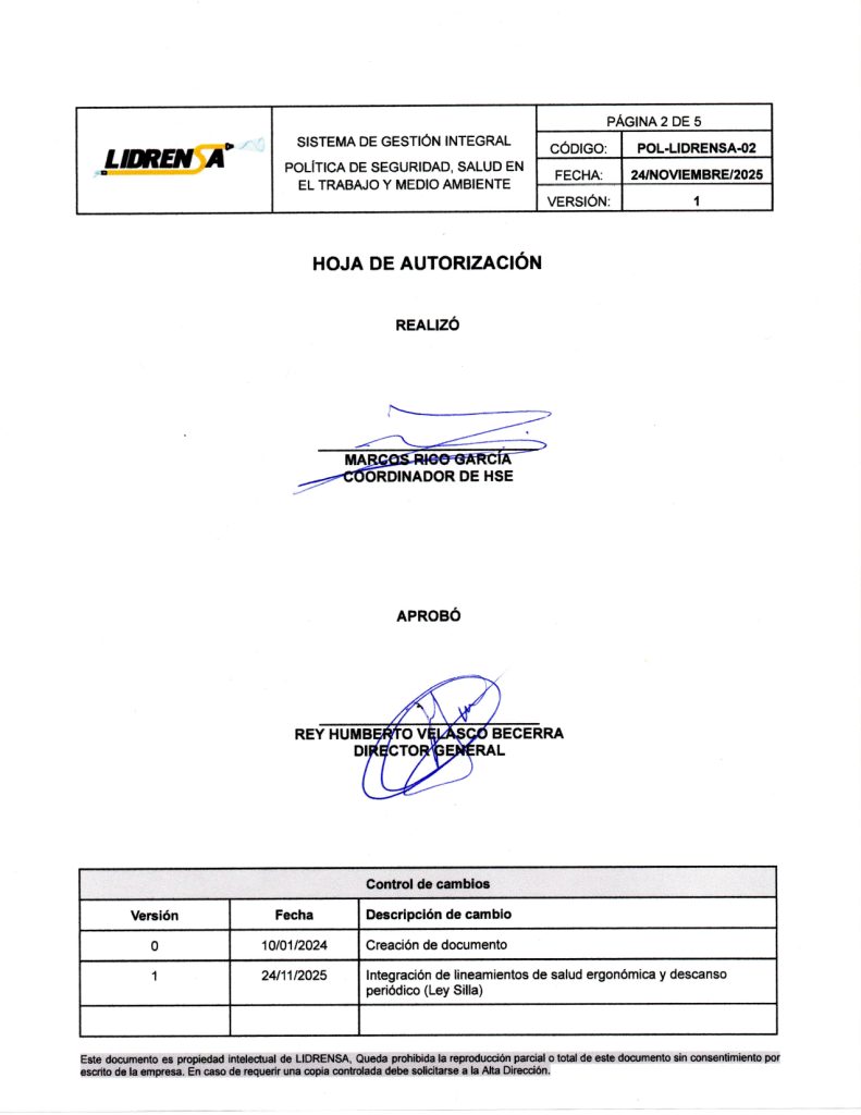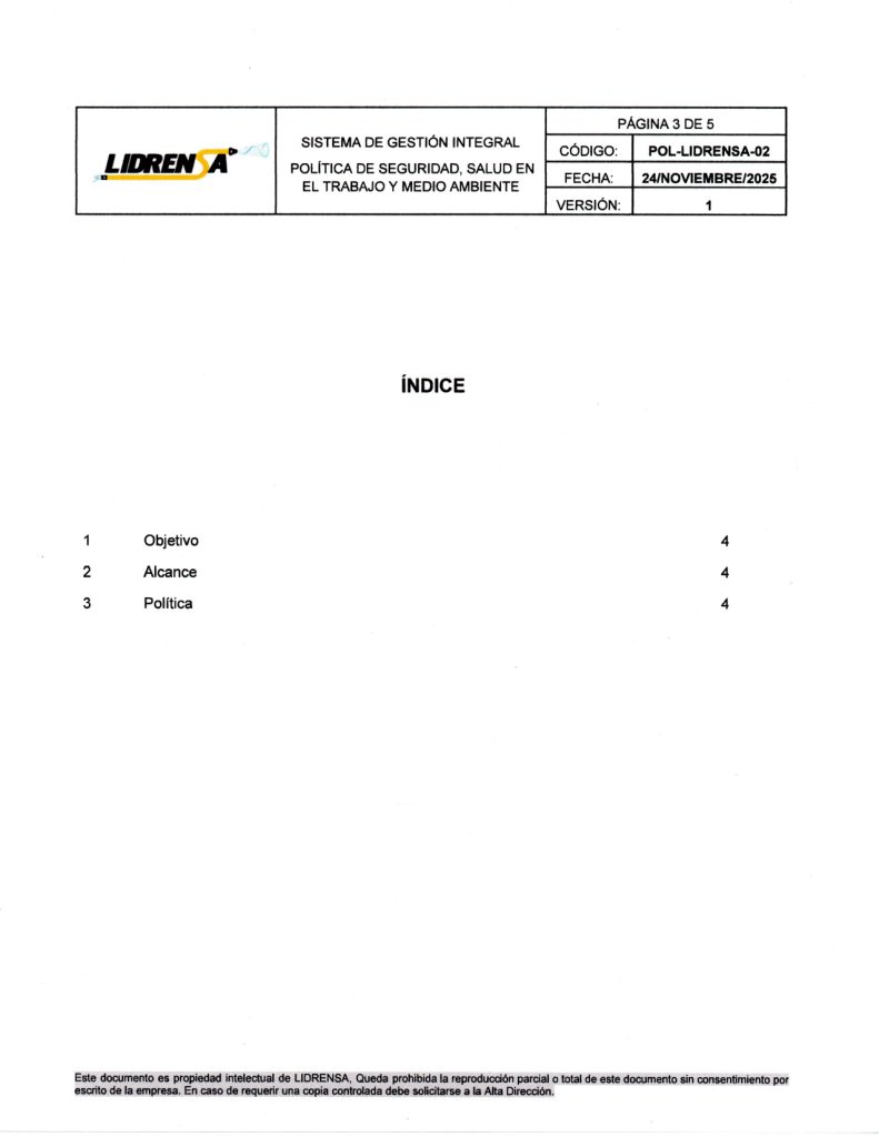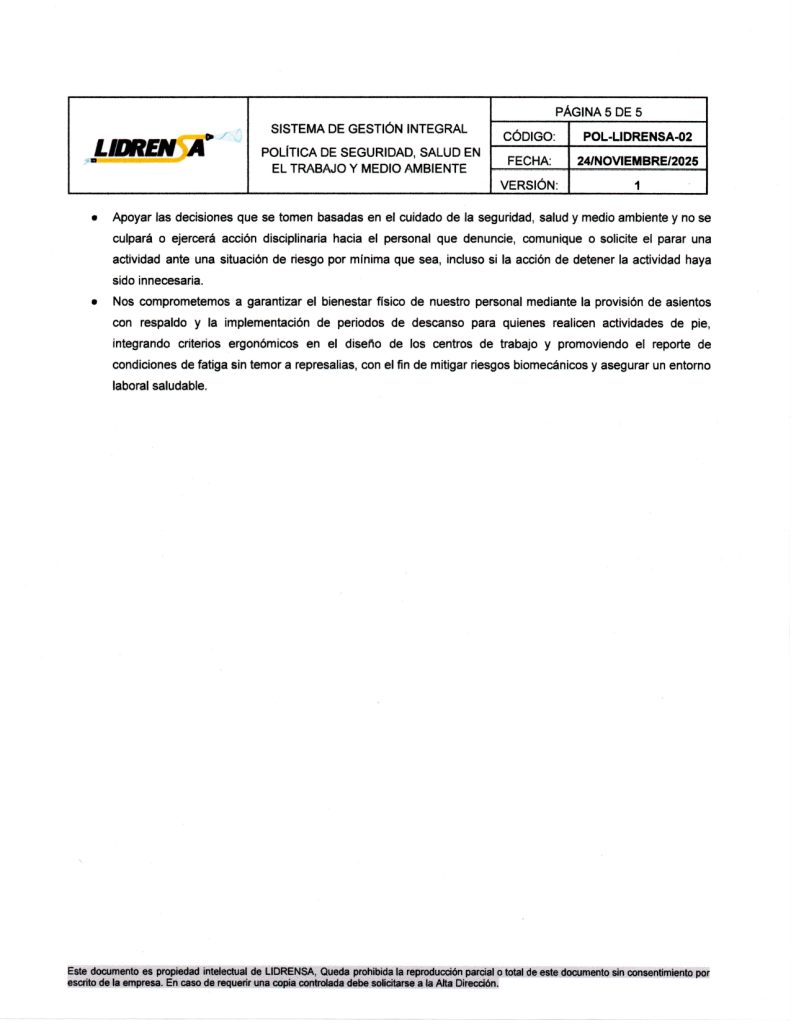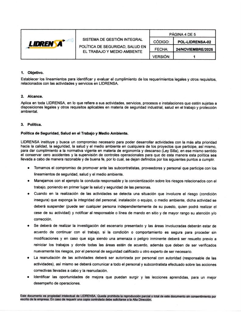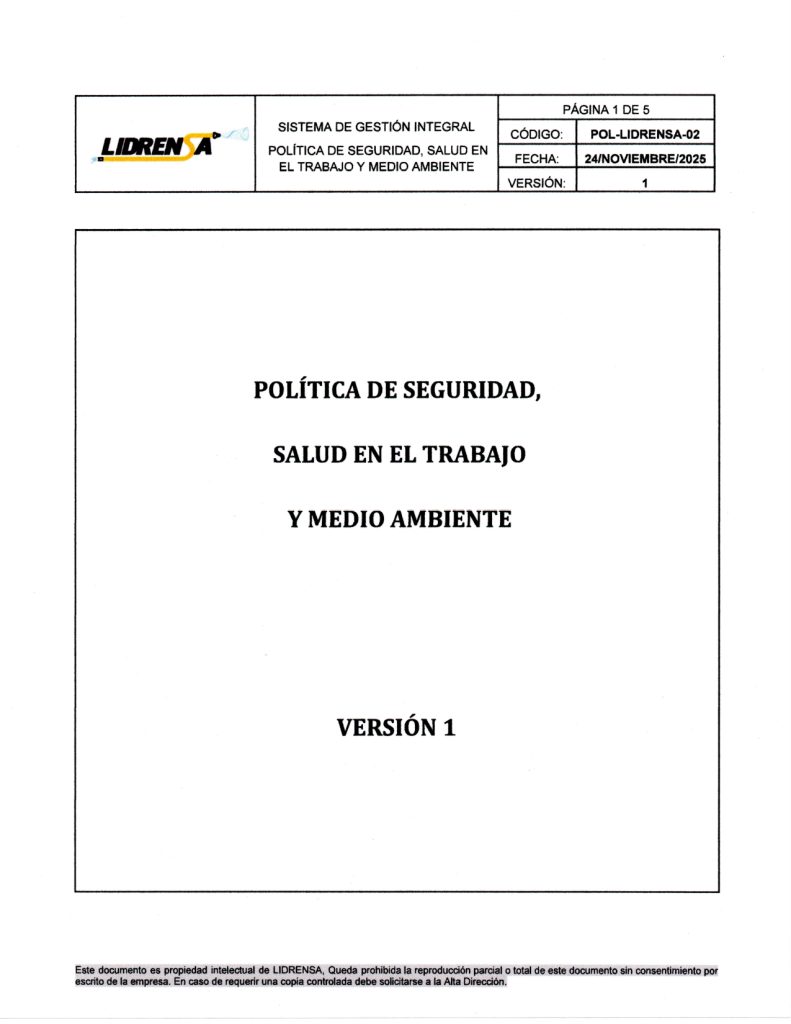 Lidrensa comparte con las partes interesadas como clientes, usuarios, socios, personas de la organización, proveedores externos nuestro Sistema de gestión Integral Política de Seguridad, Salud en el Trabajo y Medio Ambiente. Noviembre 2025 Versión: Uno