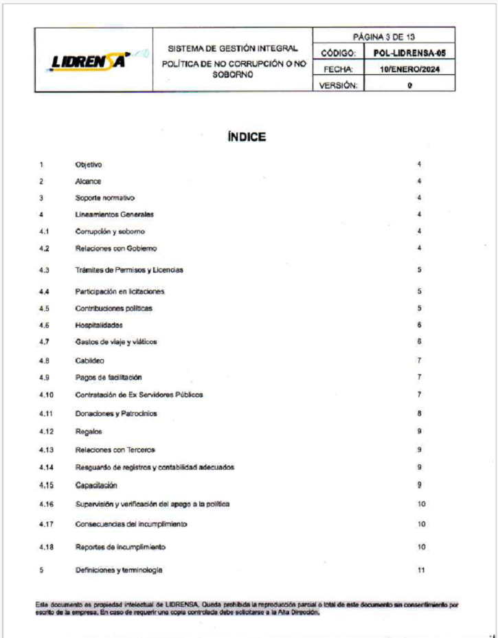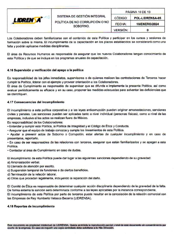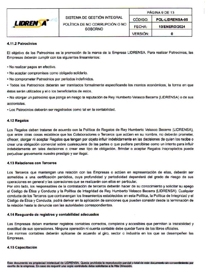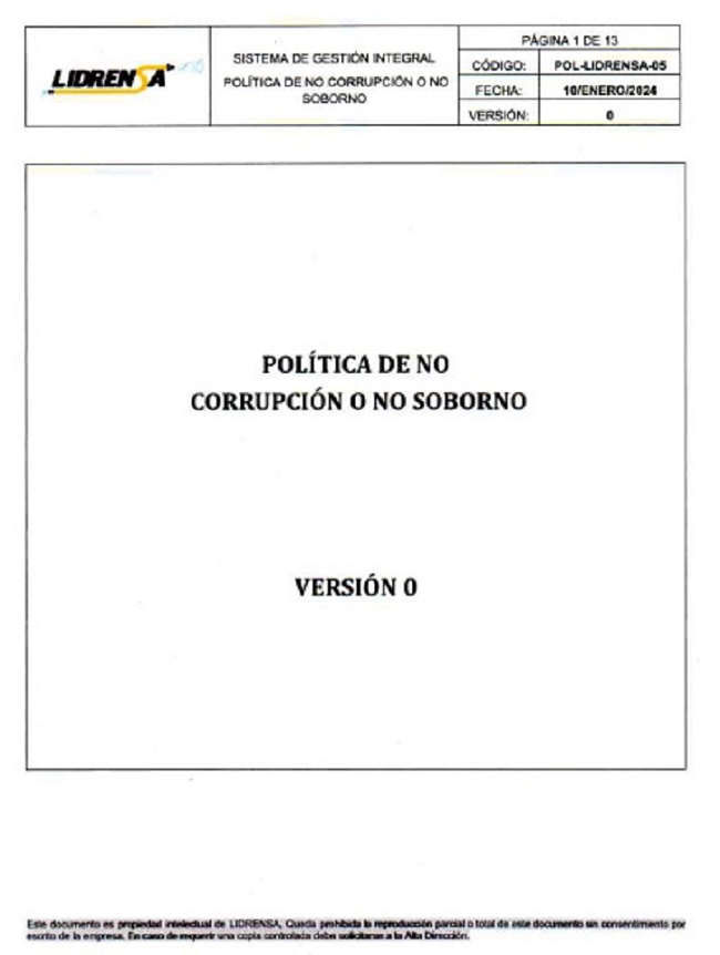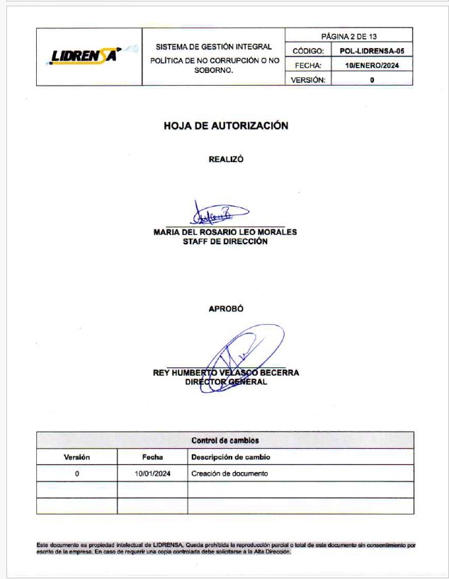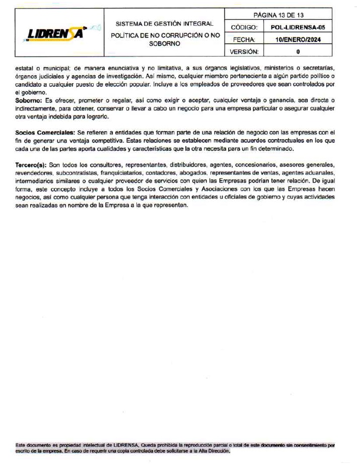 Lidrensa comparte con las partes interesadas como clientes, usuarios, socios, personas de la organización, proveedores externos nuestro Sistema de gestión Integral Política de No Corrupción o No Soborno, Enero 2024 Versión: Cero