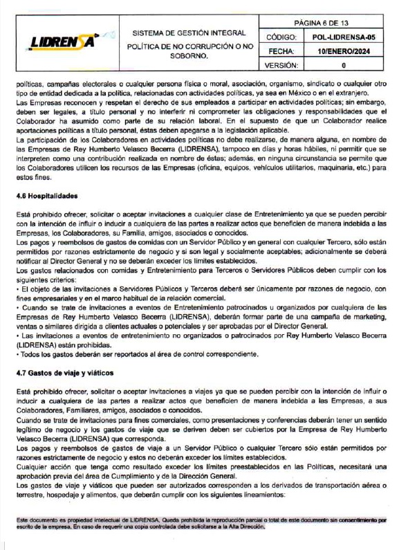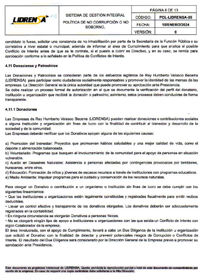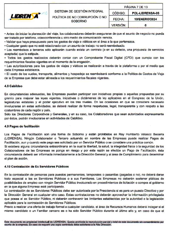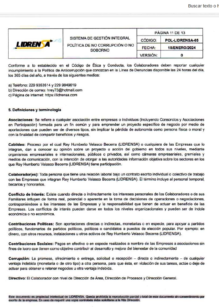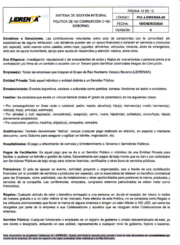 Lidrensa comparte con las partes interesadas como clientes, usuarios, socios, personas de la organización, proveedores externos nuestro Sistema de gestión Integral Política de No Corrupción o No Soborno, Enero 2024 Versión: Cero